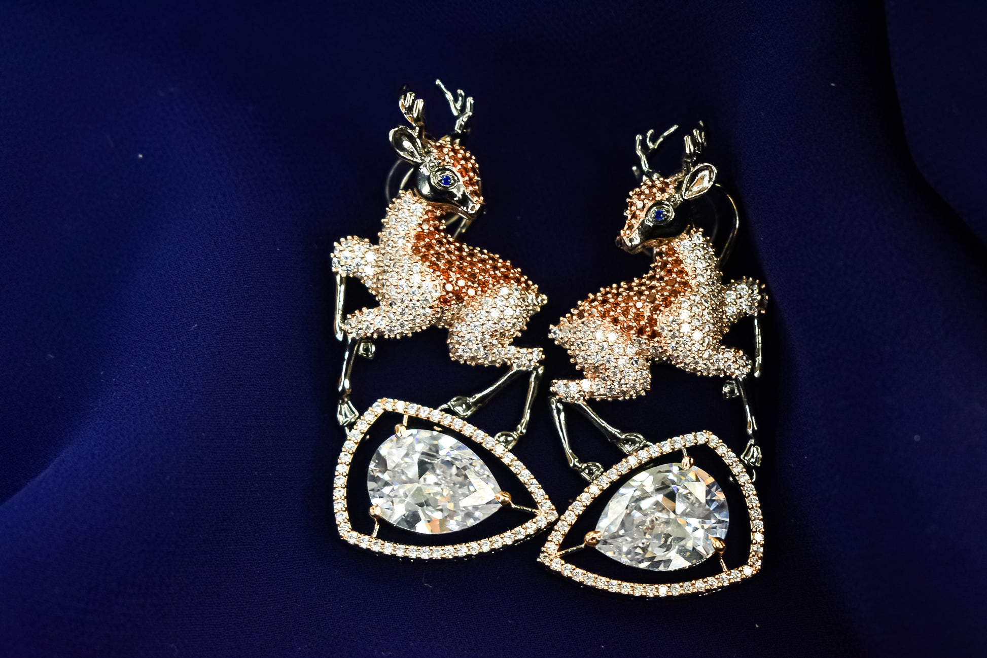 Get ready to dazzle with Charvi Rose Gold Polish Deer AD Designer Earrings ! Made with CZ stones and AD accents, these earrings add a touch of elegance to any outfit. Featuring 2-tone plating and premium quality, they're the perfect accessory for any occasion. Unleash your inner sparkle with Charvi Rose Gold Polish Deer AD Designer Earrings !