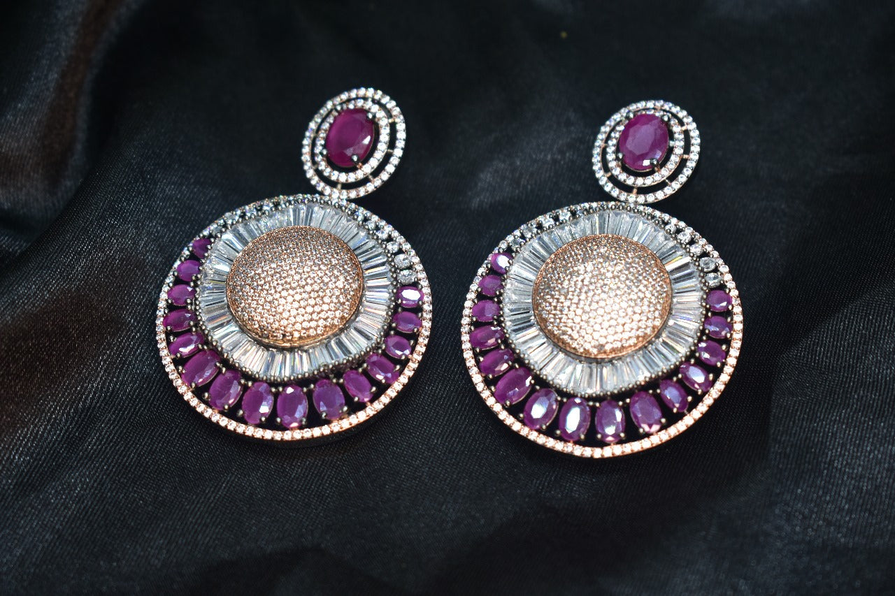 AD stud earrings with purple stones add a pop of royal elegance—pair them with lavender, silver, or deep plum outfits for a coordinated festive or party look. Keep your makeup soft and accessories minimal to let the earrings shine as your statement piece.
