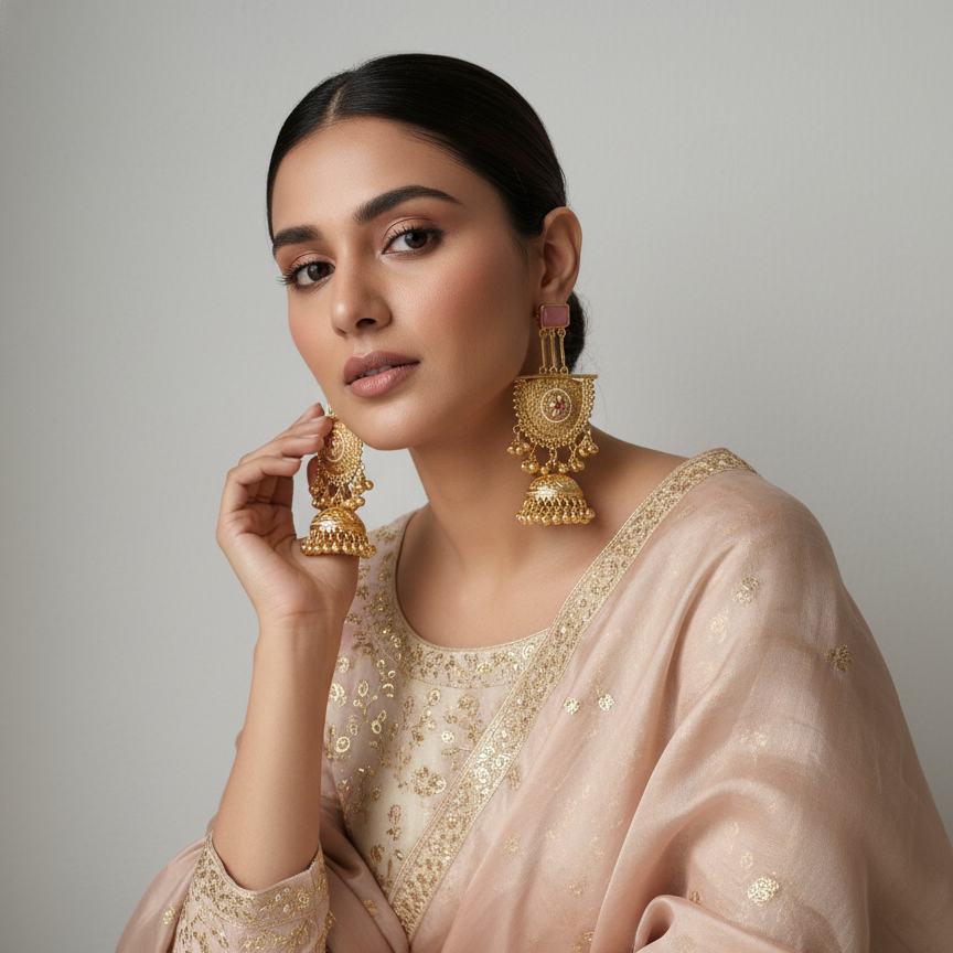 Pair Kashmiri Ghungroo jhumka earrings with a simple kurta or saree to let their intricate detailing shine. Keep your neckline minimal—skip heavy necklaces—so the earrings remain the statement piece. A sleek bun or soft waves will highlight their movement and charm, adding elegance to both festive and casual looks.