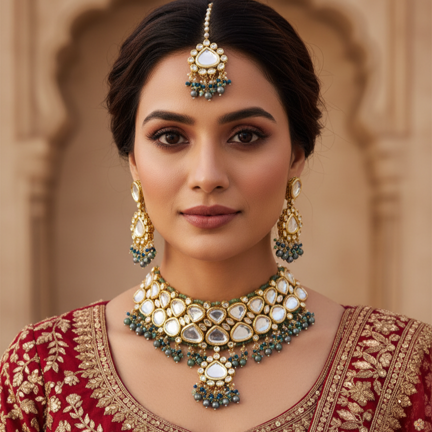 Pair your Kundan necklace with grey polki drops against a rich silk or organza base in ivory, charcoal, or muted pastels. Opt for a deep neckline to let the piece shine. A soft smokey eye adds just the right drama.