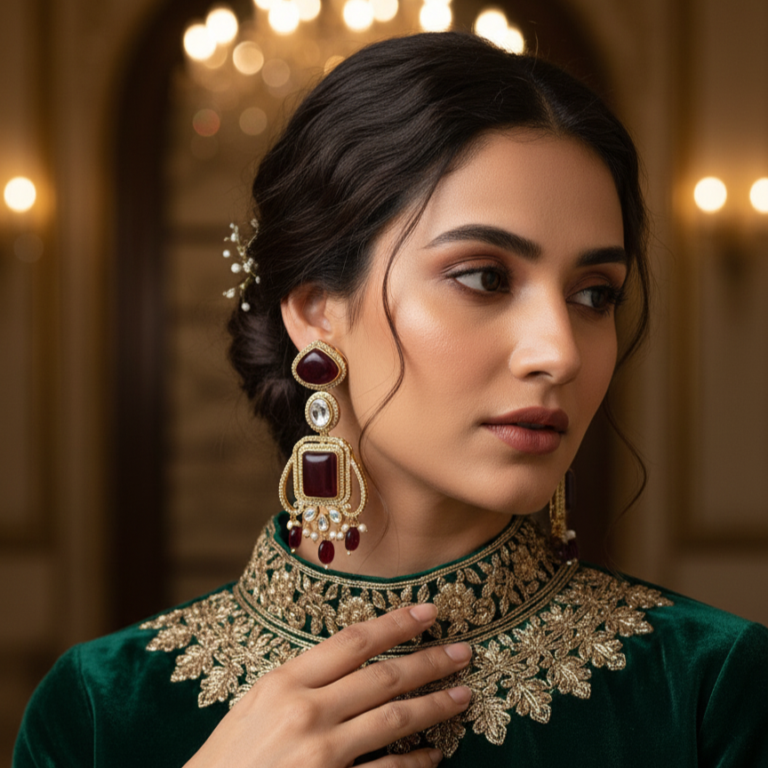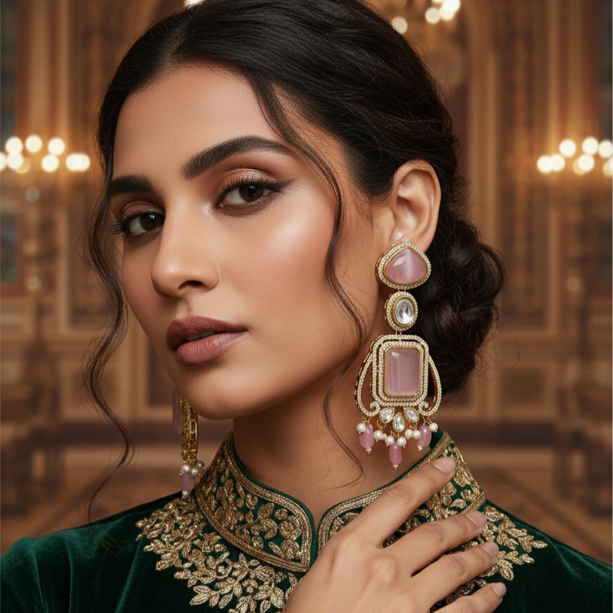 Let the vibrant hues of your drop earrings take center stage by pairing them with a solid-colored outfit—think ivory, beige, or deep maroon. Opt for a sleek low bun or soft waves to highlight the earrings, and finish with a matching bindi or dupatta in orange or pink for a cohesive, festive look. Keep the neckline simple to let the earrings dance with every move.